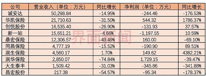 界面新闻记者梳理发现,受车险综改、疫情等因素影响,9家公司营业收入下滑,归属于挂牌公司股东的净利润(以下简称“净利润”)普遍承压,仅4家公司实现盈利。