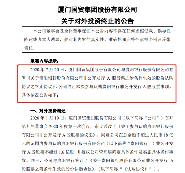 原标题:45亿定增再度生变!贵阳银行撤回申请将重新申报,厦门国贸宣布终止认购,原因竟是这个