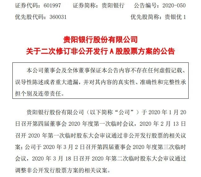 3月2日,贵阳银行依据再融资新规对定增方案进行了第一次调整,3月20日获得贵州银保监局同意,当月获得证监会受理。