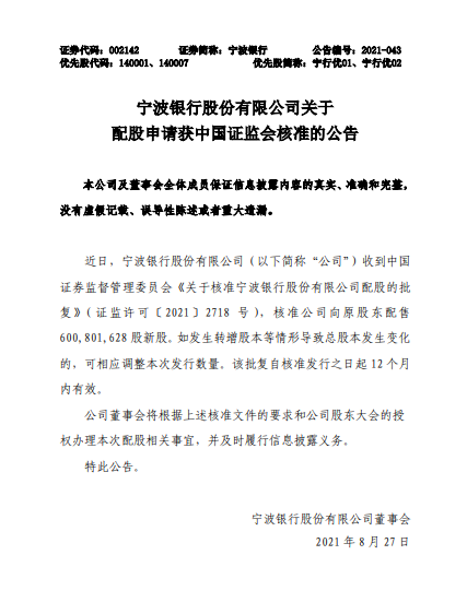8月26日消息,宁波银行发布公告,近日,公司收到中国证券监督管理委员会《关于核准宁波银行股份有限公司配股的批复》(证监许可〔2021〕2718号),核准公司向原股东配售6.008亿股新股。如发生转增股本等情形导致总股本发生变化的,可相应调整本次发行数量。该批复自核准发行之日起12个月内有效。