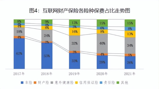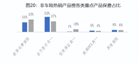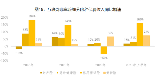 根据保险业协会统计,在前60个互联网非车险热销产品中,2021年仍主要聚焦于退货运费险和以百万医疗险为主的健康险产品,保费收入占比分别为43%和37%。其中,退货运费险保费占比同比上升9个百分点,而以百万医疗为主的健康险产品保费占比同比下降15个百分点。信用保证类保险产品保费占比为10%,同比上升9个百分点。即在增幅方面信用保证类险和退货运费险并列排第一名。