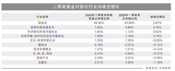 多位基金经理表示,下半年A股市场风格将更为均衡,一方面,顺周期的金融、地产等低估值板块有机会迎来修复;另一方面,业绩确定性较高和高景气高成长的行业依旧有结构性投资机会。结合二季度末行业配置情况来看,制造业、租赁和商务服务业成为基金二季度重点加仓的方向。