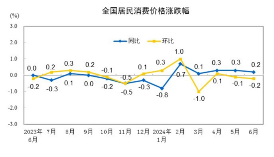 国家统计局:6月CPI同比上涨0.2% 环比下降0.2%