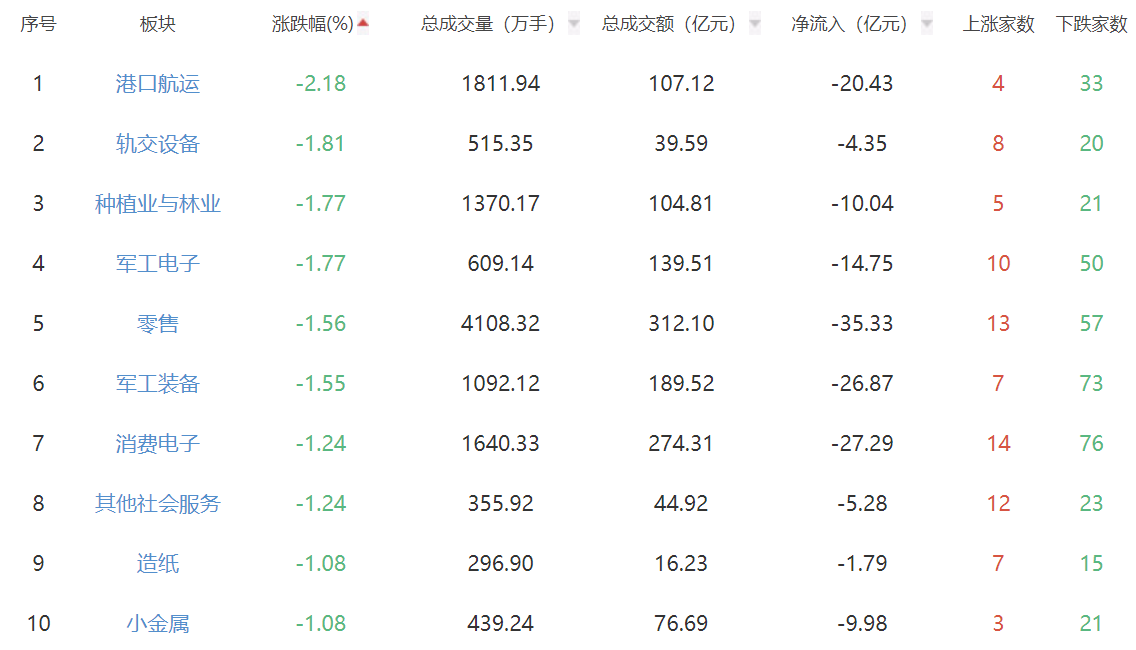 板块方面,美容护理、互联网电视、食品加工制造等板块涨幅居前,港口航运、轨交设备等板块下跌。